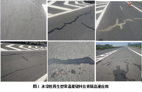 水溶性再生型常温灌缝料为针对路面裂缝快速修复而开发的一种新型乳化沥青材料,其含有的高性能新型聚合物,与SBS改性剂相比,粘弹性、恢复能力、耐疲劳能力及抗低温开裂能力更加优异,为灌缝料的耐久性及粘附性提供了有力保证。同时水溶性再生型常温灌缝料施工季节长、施工工艺简单,可对非结构性破坏裂缝进行修复,并可快速开放交通。其含有的新型聚合物改性沥青增强了与缝壁的粘结力,实现了对缝壁处沥青的再生,通过密封路面裂缝,防止水分侵入路面结构内部,延长路面使用寿命。