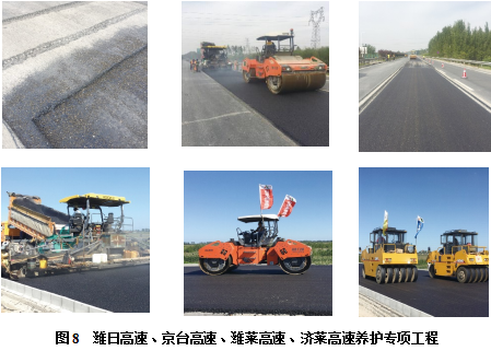 2016年,C型新型聚合物高黏沥青应用于潍日高速水稳预开裂后的下面层,试验段效果良好,并应用于京台高速曲阜段基层病害处治,效果良好;2017和2020年C型新型聚合物高黏沥青分别在京台高速、潍莱高速、济莱高速济南段及威青高速养护专项工程中使用。